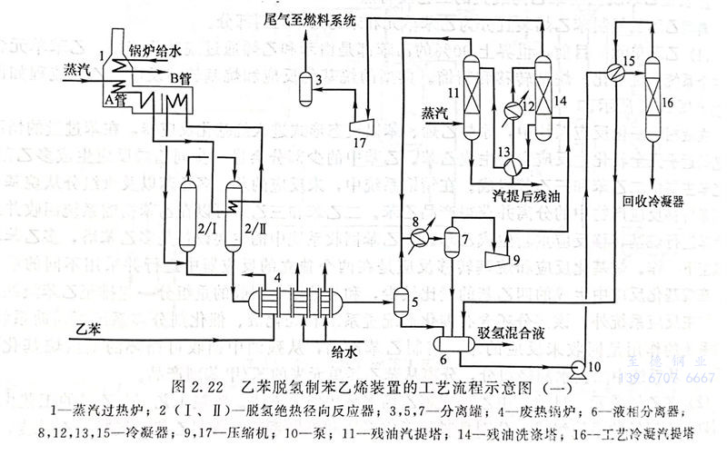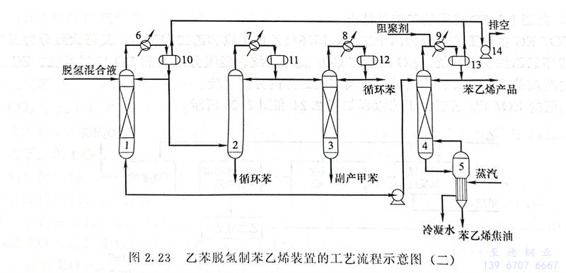 目前,由乙苯制苯乙烯多采用脱氢方法。脱氢工艺制苯乙烯的工艺由两个可以独立运转的系统组成,分别是脱氢反应系统和精馏系统。典型乙苯脱氧制苯乙烯装置的工艺流程如图2.22和图2.23所示。
