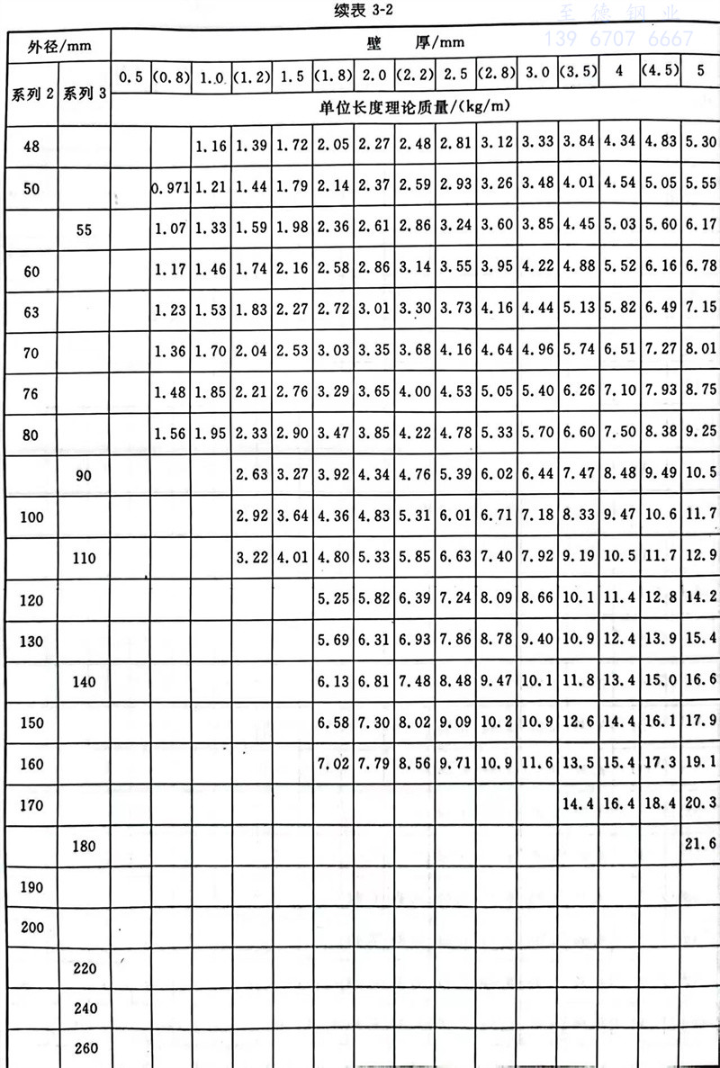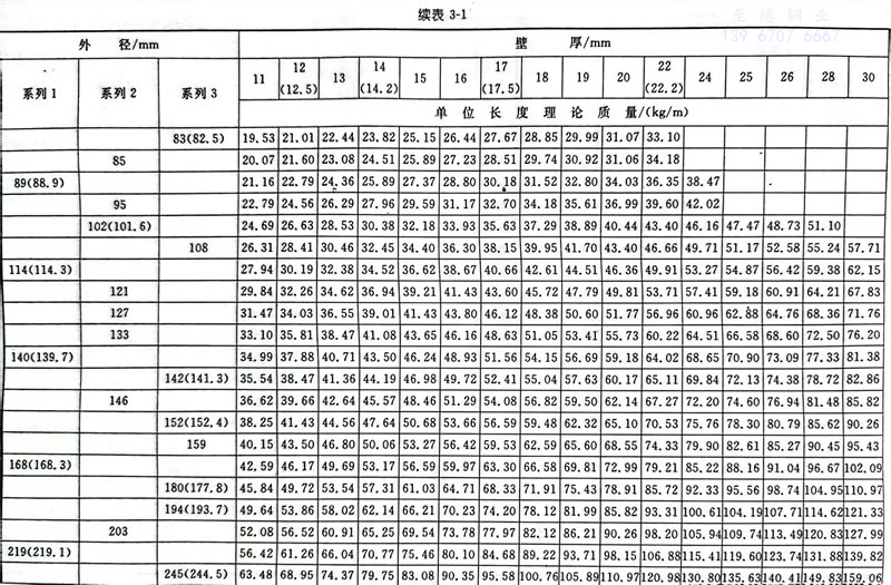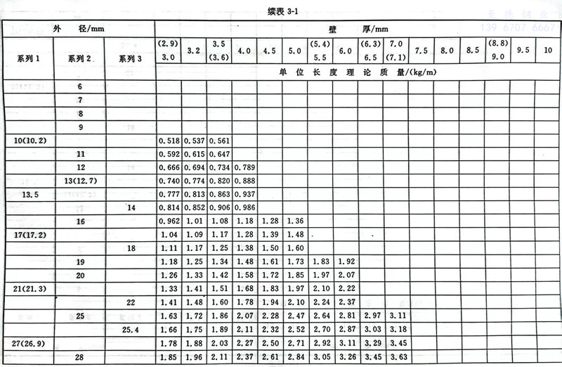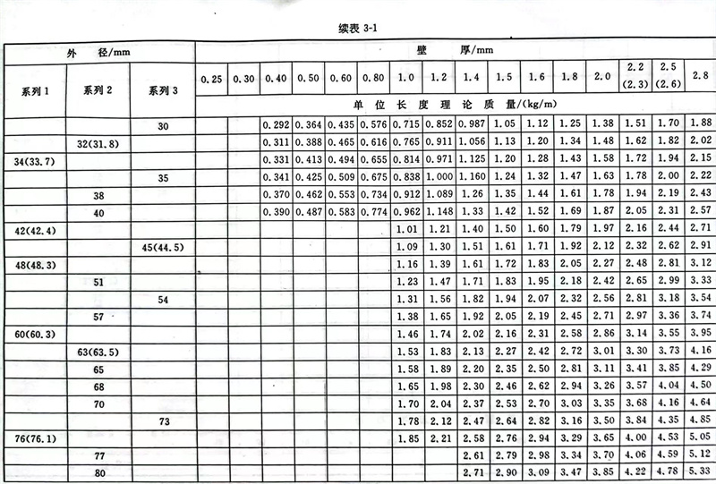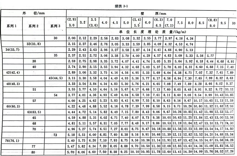 普通钢管尺寸及单位长度的理论质量见表3-1。