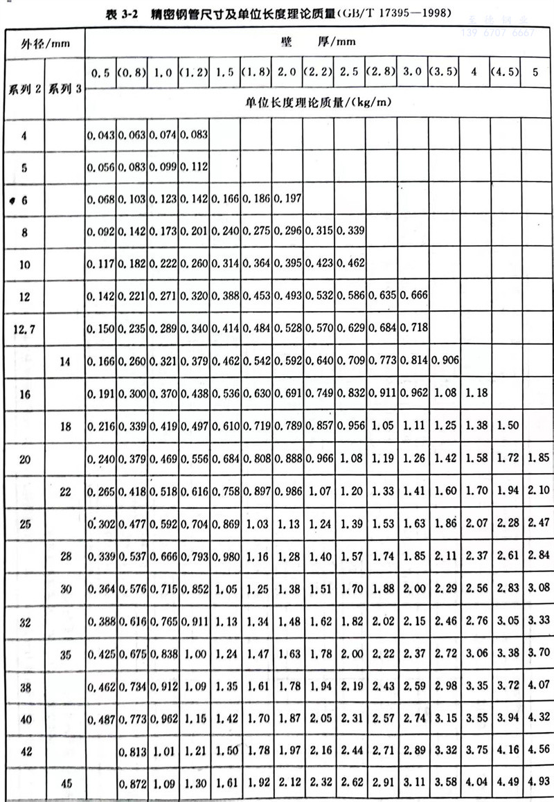 精密钢管尺寸及单位长度理论质量见表3-2。