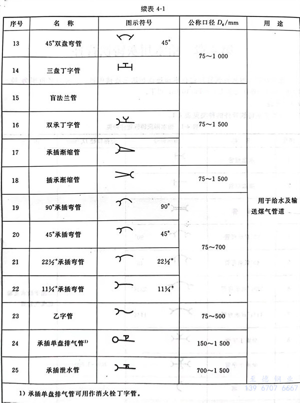 给水及煤气用灰铸铁管件包括承插连接和法兰连接两种。公称口径范围为75~1 500mm;公称压力在1.0 MPa(10 bar)以下。