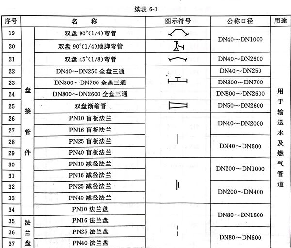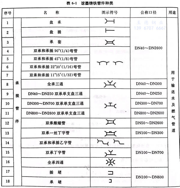 球墨铸铁管件的分类由各种接口形式派生而得。球墨铸铁管件的种类见表6-1。