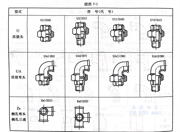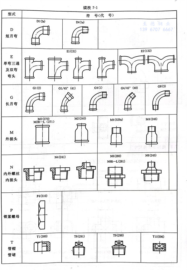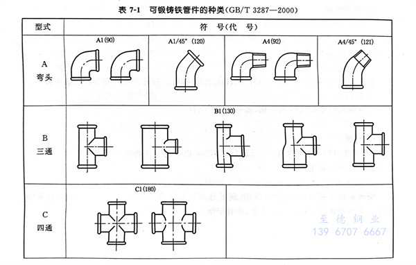 按结构型式划分的可锻铸铁管件种类见表7-1。表中的规定符号(代号)与管路识别有关,可以用于标记。