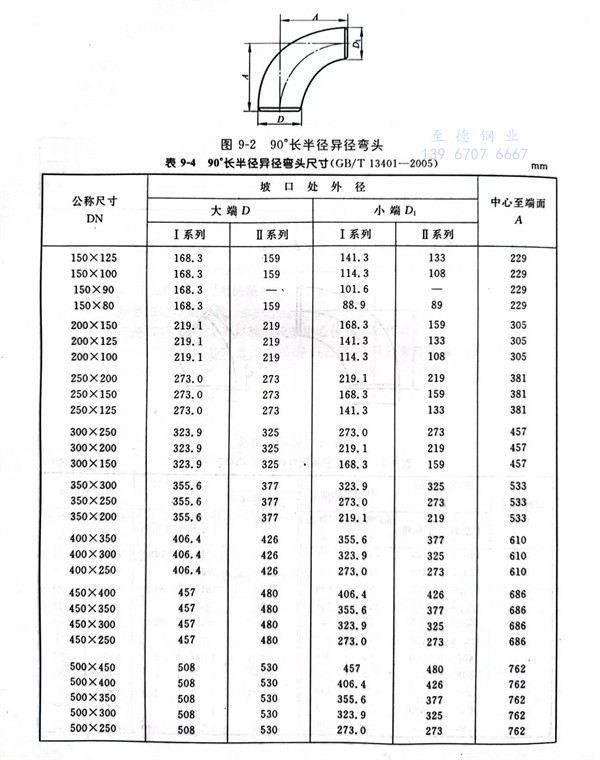 长半径弯头型式见图 9-1,尺寸见表 9-3 。
