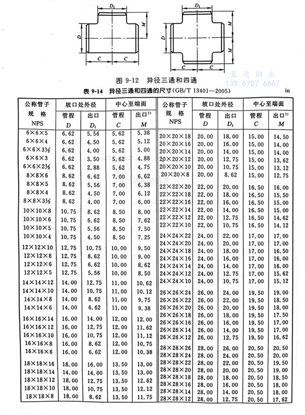 等径三通和四通型式见图 9-11,尺寸见表 9-13 。