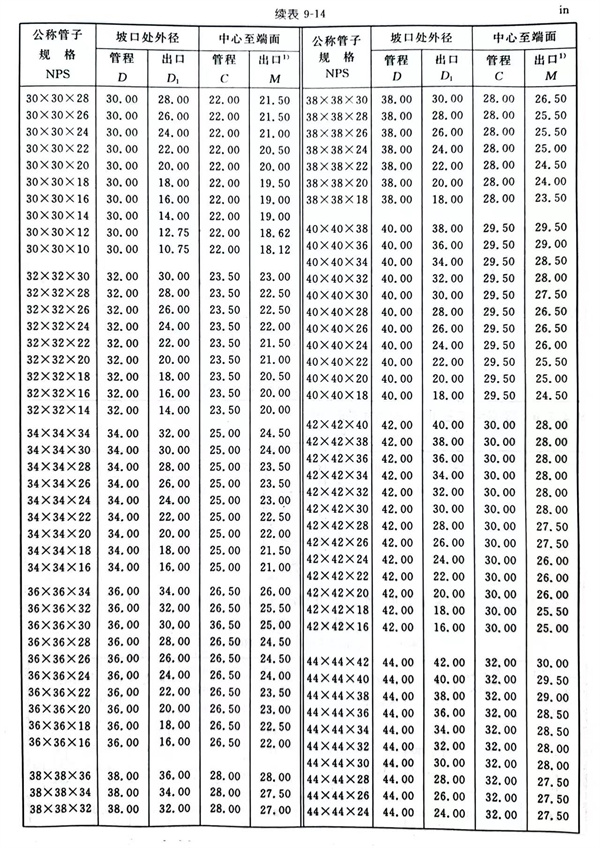 由于米制单位和英制单位的管件不能做到精确的等同,因此使用者必须分别采用两种单位制。对于尺寸为米制单位的管件,其公称尺寸用DN表示;对于尺寸为英制单位的管件,其公称尺寸用NPS表示。两者之间的关系见表9-2。