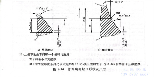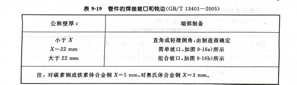 不锈钢管件焊端坡口形状及尺寸见图 9-16,管件的焊接坡口和钝边见表 9-19 。