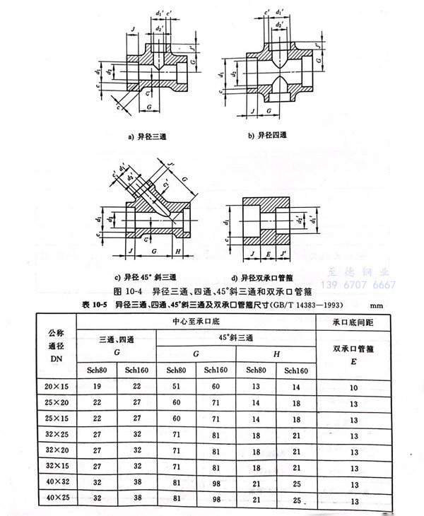 异径三通、四通、45°斜三通和双承口管箍型式见图 10-4,尺寸见表 10-5 。
