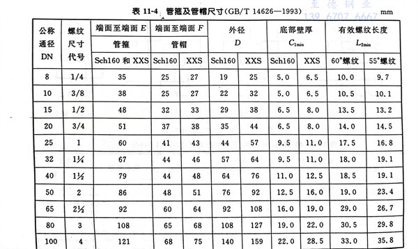 鉴于GB/T 14626-1993《锻钢制螺纹管件》主要参照美国国家标准 ANSI B16.11-1980《锻钢承插焊和螺纹管件》制定,因此螺纹管件按计算其压力额定值的基准管子分为Sch80、Sch160和XXS 3个壁厚等级。这3个壁厚等级与ANSI B16.11中压力等级的对应关系见表11-2。