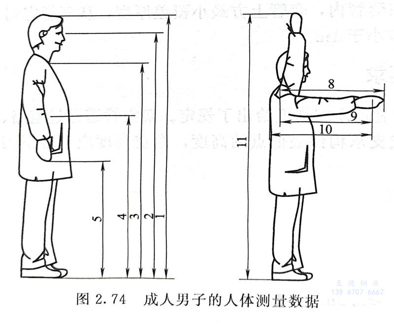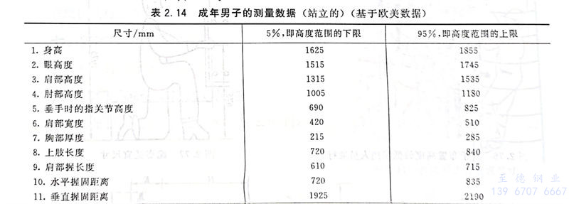在设计中不能一律以平均值作为依据,而应就具体情况而定,为了确保至少适合95%使用者的使用要求,应采用5%和95%的数据。以下数据建立在典型的欧美数据基础上,比我国的人体尺寸略大一些。通常装置的设计寿命为15~20年,有的装置甚至操作更长的时间,考虑到年轻一代身高迅速增高的事实,在设计中采用这些数据基本是可行的。成年男子的人体测量数据见图2.74和表2.14。