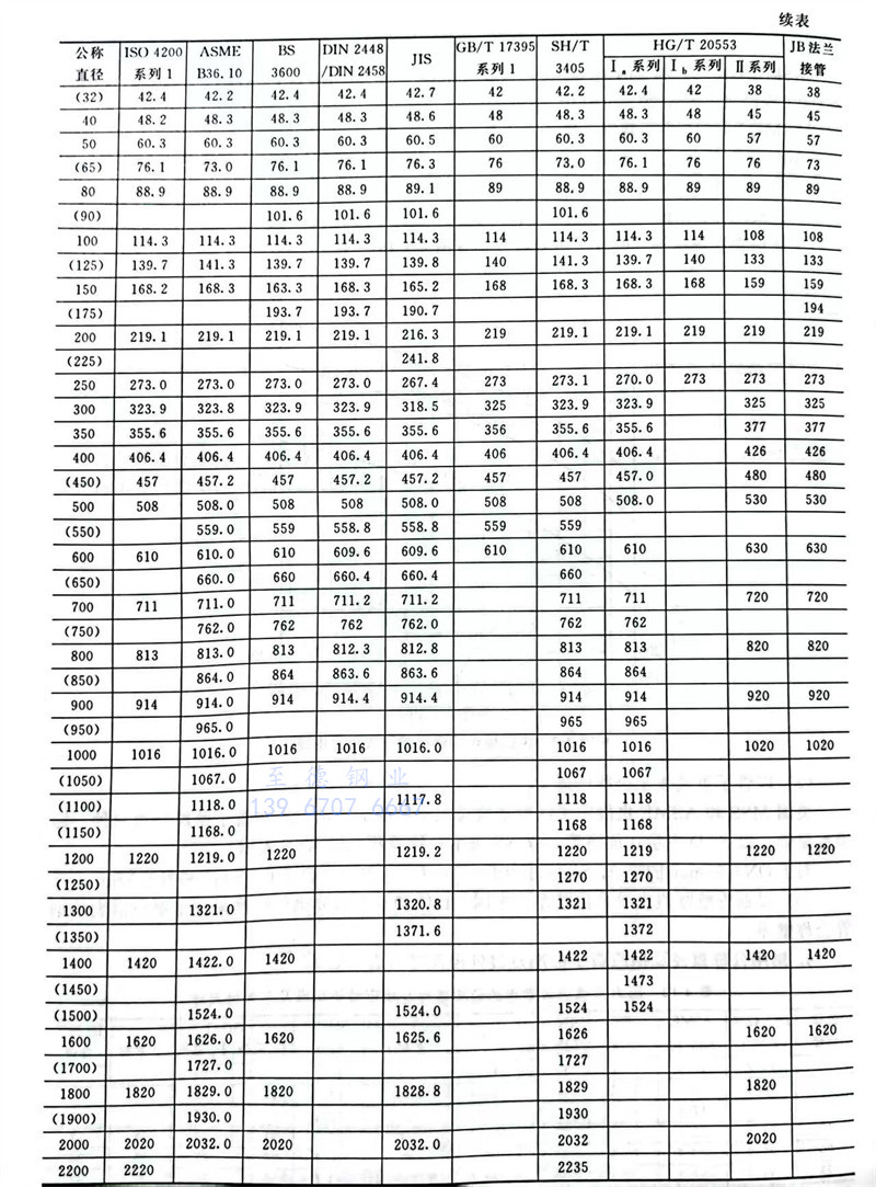 公称直径及相应管子标准及其外径尺寸规格对照表