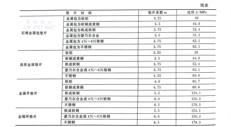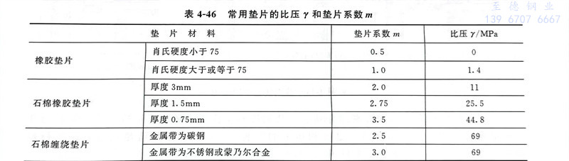 非金属和半金属垫片的应力松弛率按《管法兰垫片应力松弛试验方法》(GB/T 12621)测得。这两类垫片的压缩率和回弹率按《管法兰垫片压缩率及回弹率试验方法》(GB/T12622)测定。此外,国标还规定了缠绕垫的试验方法,见GB/T 14180。常用垫片的比压γ和垫片系数m见表4-46。