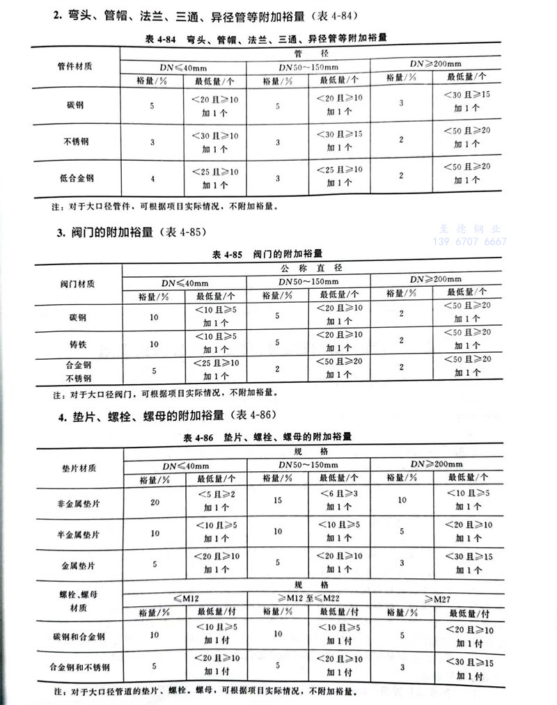 ⑤. 应对管子、阀门、法兰、管件(对焊、承插焊和螺纹管件)、紧固件、垫片分别列出其余量系数。
