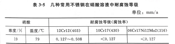 表3-5 几种常用不锈钢在硝酸溶液中耐腐蚀等级