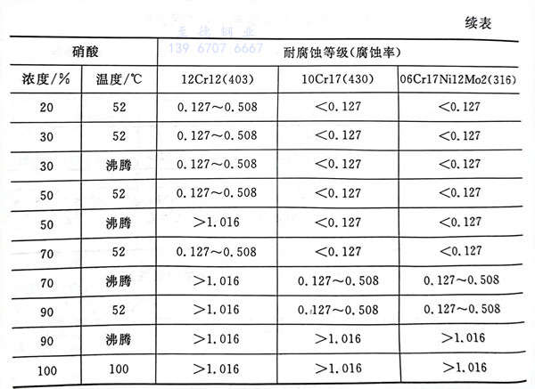 不锈钢是耐硝酸腐蚀的良好材料。在制造硝酸设备中,几乎全部使用了奥氏体不锈钢。不但如此,为了强化不锈钢的钝化薄膜,在生产中常常采用酸洗来钝化处理不锈钢。酸洗钝化处理就是将不锈钢浸渍在一定浓度一定温度的硝酸溶液中进行的。有关不锈钢在硝酸溶液中的耐腐蚀等级,见表3-5。