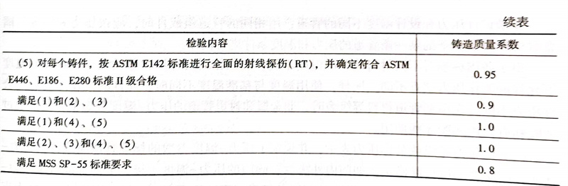 相对于轧制或锻制的不锈钢管道元件,铸件缺陷相对较多,机械性能有所下降。在ASME B31.3中,为了衡量铸件机械性能下降的程度,用铸造质量系数来表示。铸造质量系数同样与无损探伤的检验数量有关。一般情况下,符合材料基本要求且根据MSS SP-55的规定已经过肉眼检验的静态铸件,可取其基本铸造质量系数为0.8,对每一铸件进行补充检验后可以按表3.1.5的要求提高。铸件用作压力管道及其元件的情况并不多,DN≥50阀门的阀体常采用铸件,阀门阀体的强度设计一般由制造商进行,多数阀门标准已经给出了最小壁厚要求,实际管道设计中很少用到铸造质量系数这个概念。ASME B31.3规定,用于剧烈操作条件下及工艺介质管道上的焊接和铸造不锈钢管件,其焊接质量系数和铸造质量系数均不得低于0.9。在国内外管道设计标准规范中,有铸造质量系数的规定。例如,GB 50316规定:如对铸件进行补充检测,质量系数可提高至表内规定的数值,但在任何情况下,质量系数不应超过1.00。