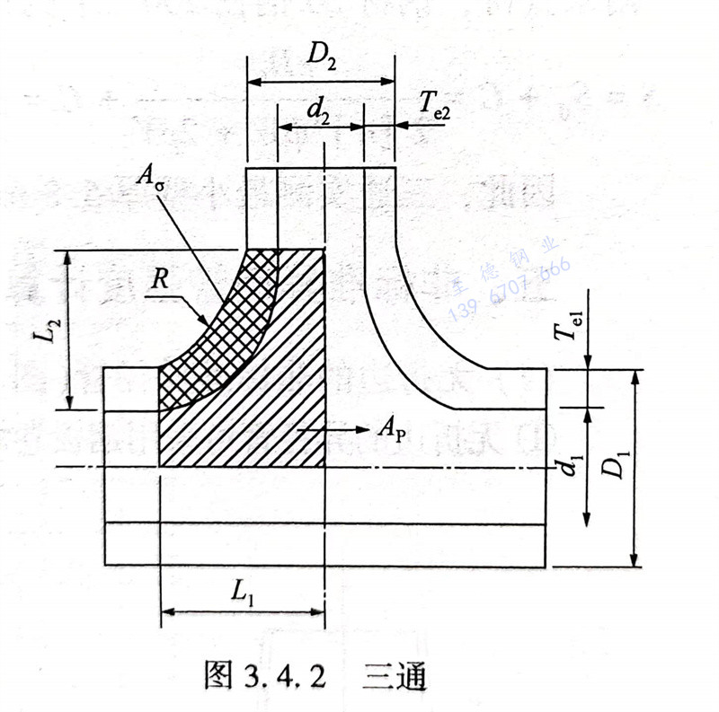 挤压不锈钢三通的壁厚计算应采用压力面积法,计算时,应控制三通承载截面上的一次应力不超过材料在工作温度下的许用应力,许用应力应按式(3.4.10)计算。承受内压的三通外形见图3.4.2承载区的尺寸应按式(3.4.11)和式(3.4.12)计算。