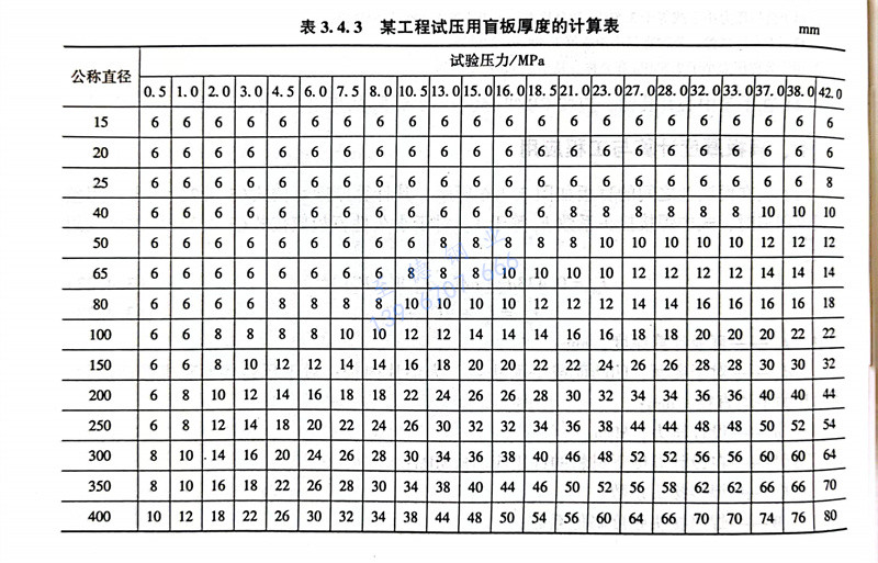 某工程计算试压用盲板厚度,管道设计人员根据式(3.4.22),并根据管道特性参数,进行计算,如表3.4.3所示。