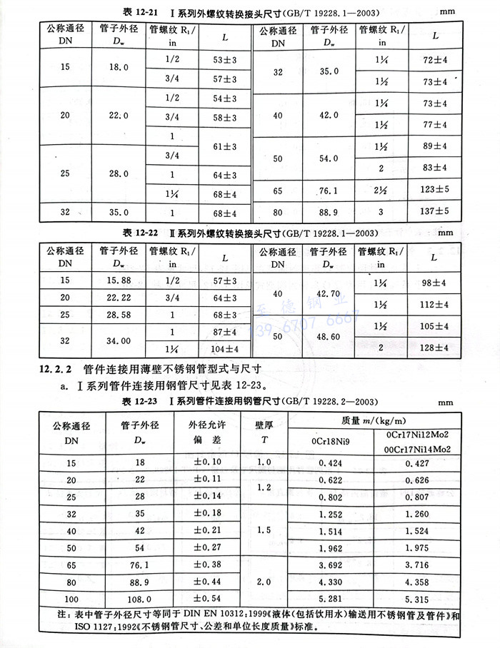 a.Ⅰ系列管件连接用薄壁不锈钢管尺寸见表12-23。