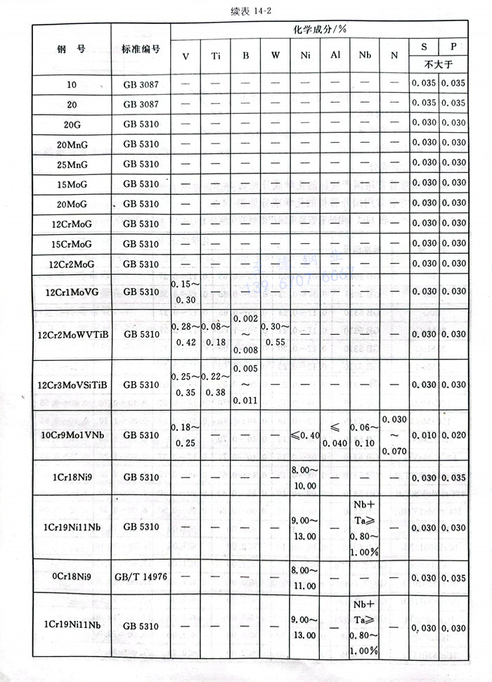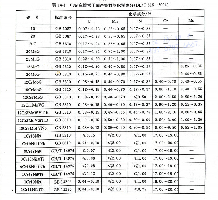 a. 电站弯管常用国产管材的化学成分见表14-2。