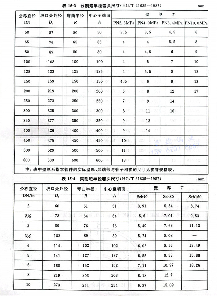 短半径弯头型式见图15-2,公制三通尺寸见表15-3;英制三通尺寸见表15-4。