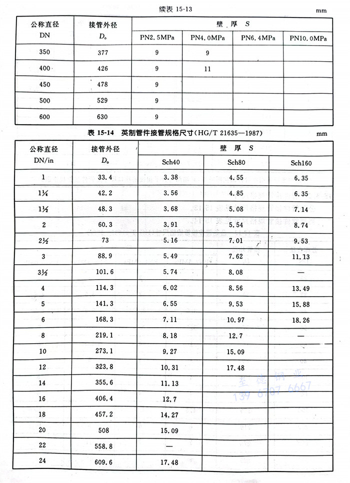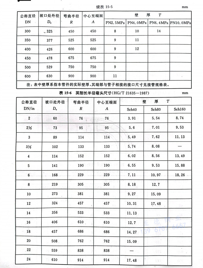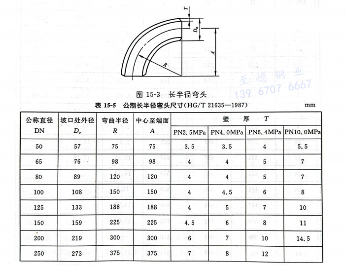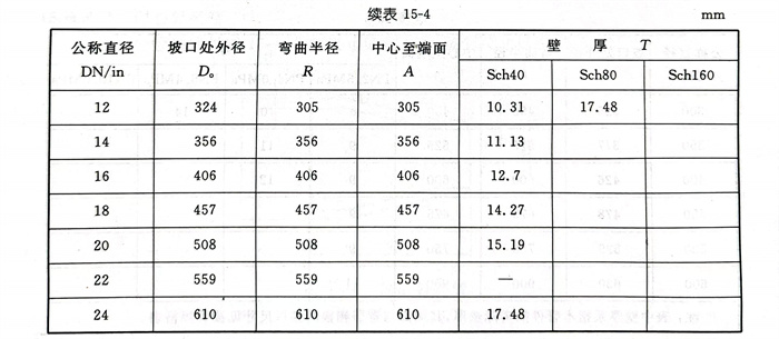 长半径弯头型式见图15-3,公制三通尺寸见表15-5;英制三通尺寸见表15-6。