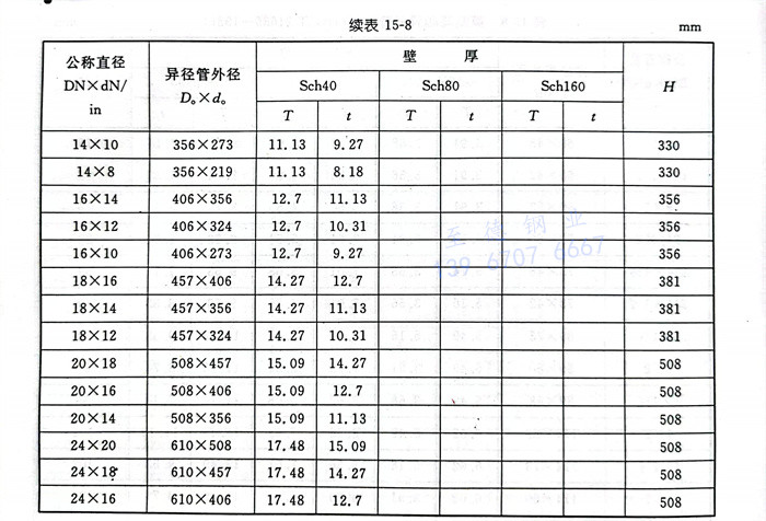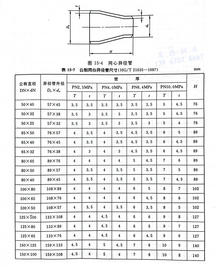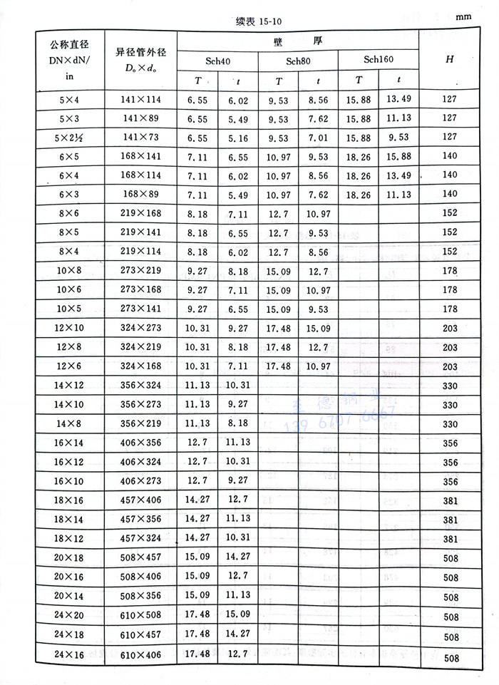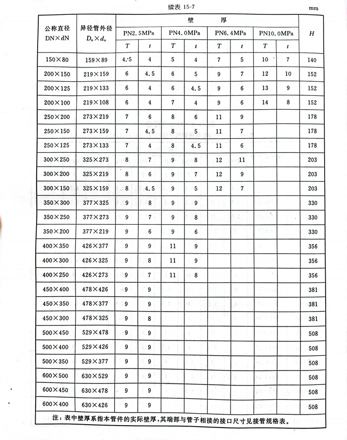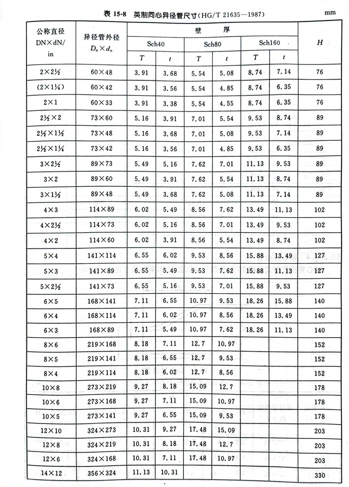 同心异径管型式见图15-4,公制三通尺寸见表15-7;英制三通尺寸见表15-8。