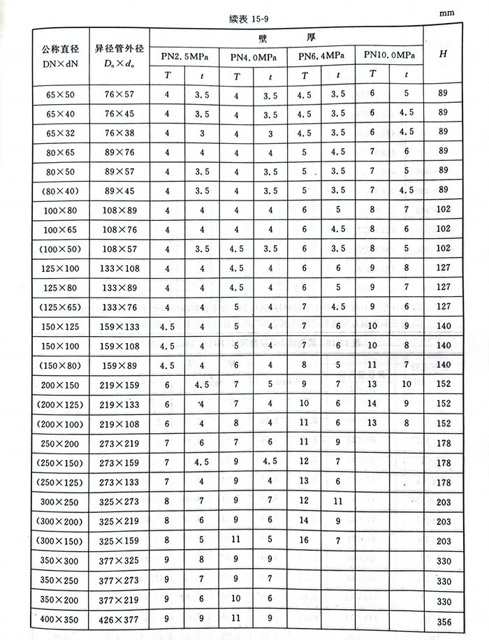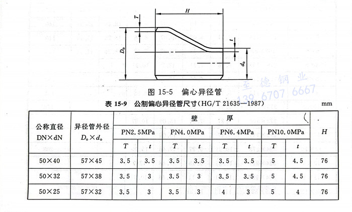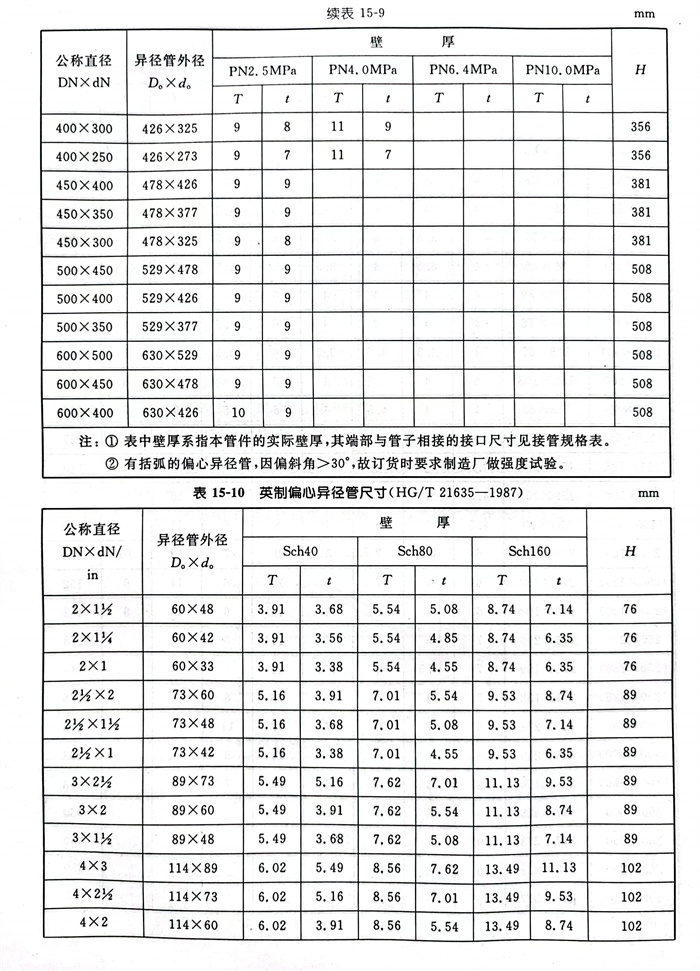 偏心异径管型式见图15-5,公制三通尺寸见表15-9;英制三通尺寸见表15-10。