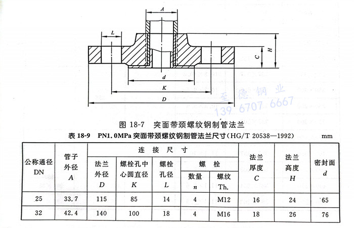 PN1.0MPa突面带颈螺纹钢制管法兰型式见图18-7,尺寸见表18-9。