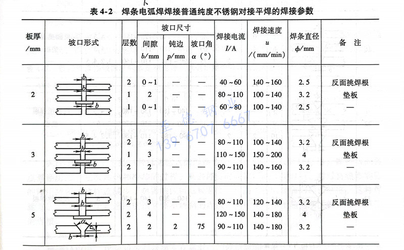 普通纯度铁素体不锈钢管用焊条电弧焊进行对接平焊时,坡口形式及焊接参数见表4-2。从表中可以看出,采用的是小的热输人,目的是抑制焊接区的铁素体晶粒过分长大。施焊时尽量减小焊缝截面,不要连续多道施焊,要待前一道焊缝冷却到预热温度时,再焊下一道焊缝。