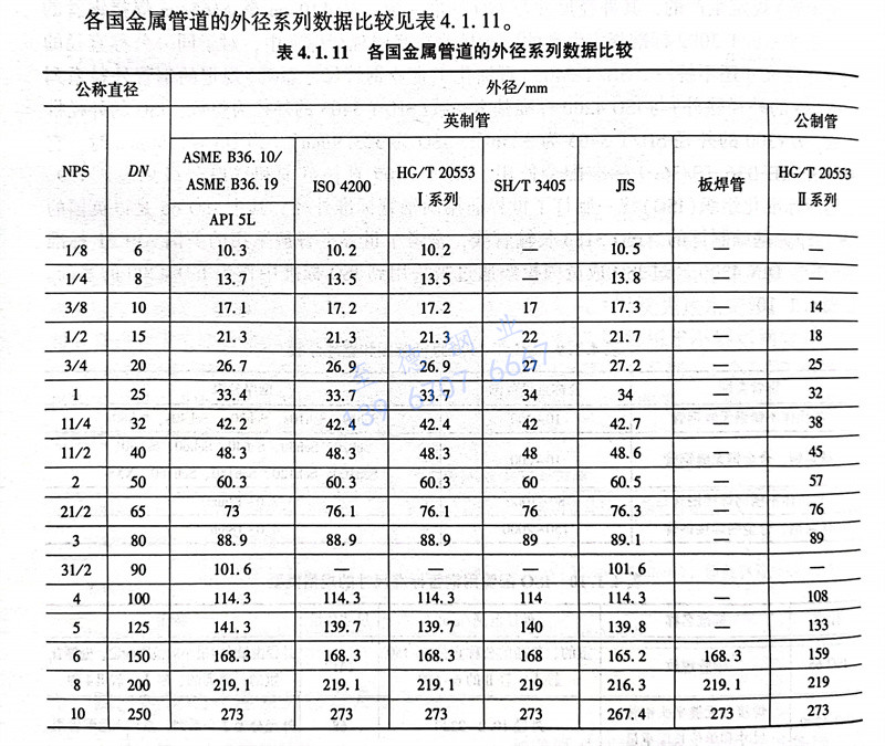 各国金属管道的外径系列数据比较见表4.1.11。