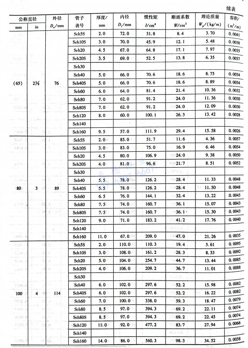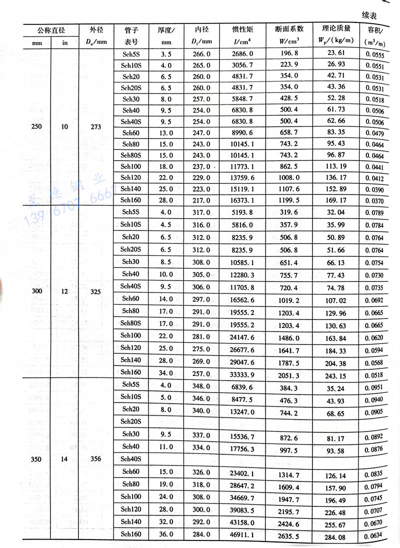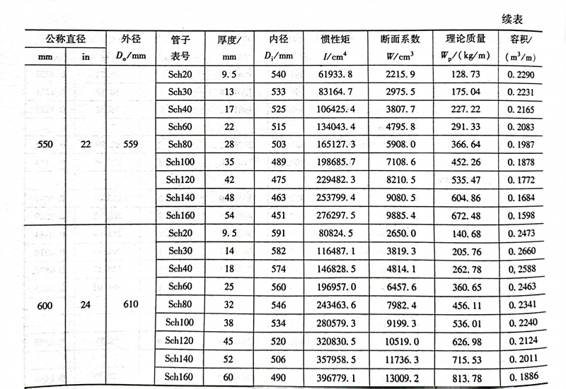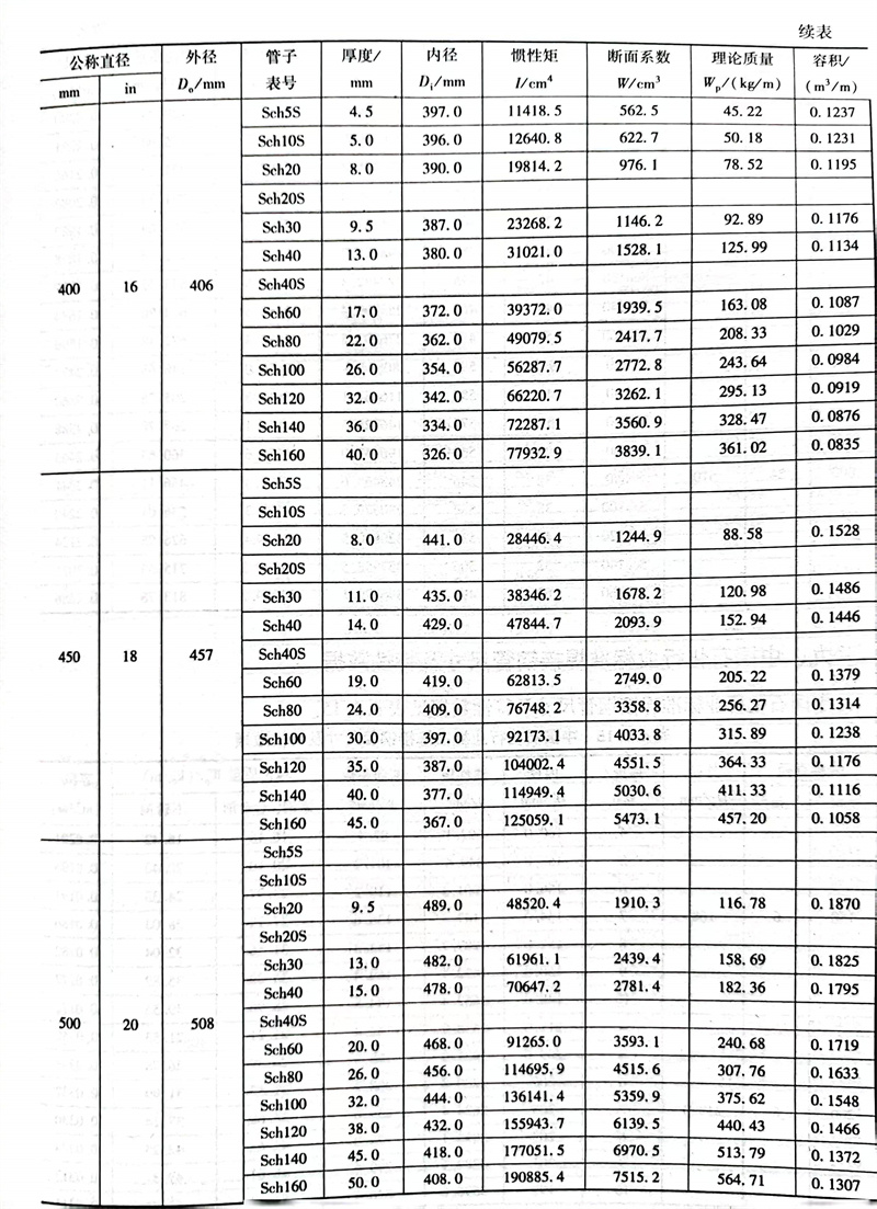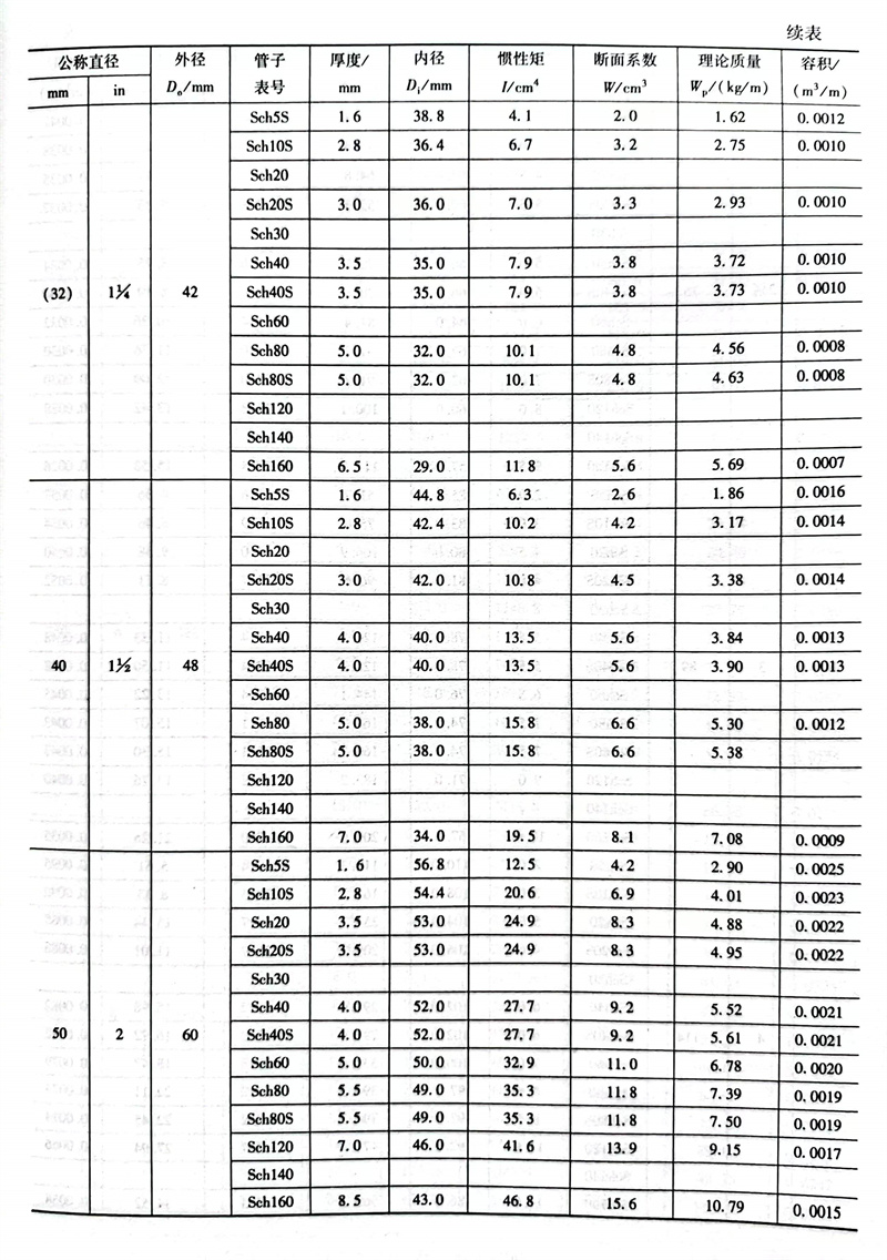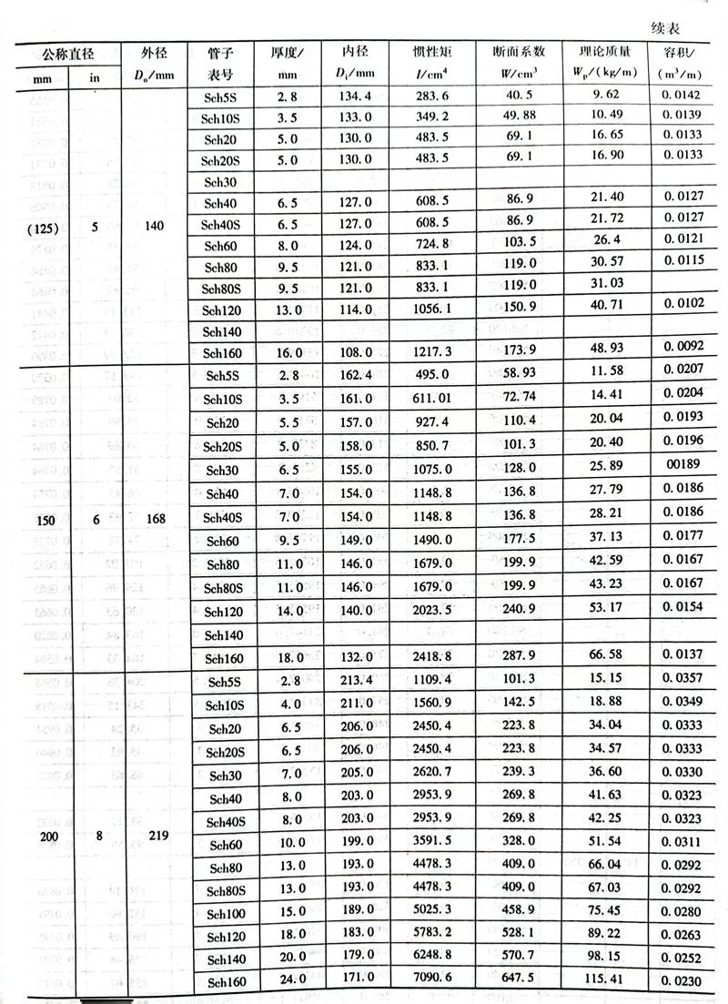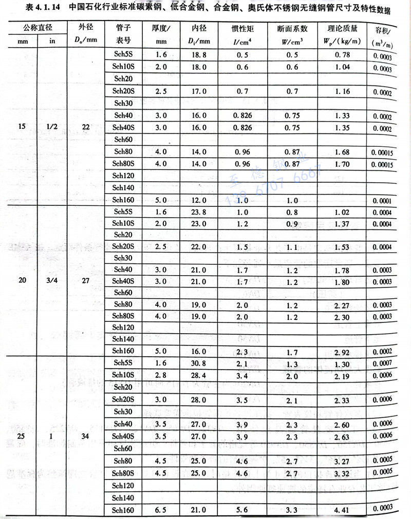 表4.1.14 中国石化行业标准碳素钢、低合金钢、合金钢、奥氏体不锈钢无缝钢管尺寸及特性数据