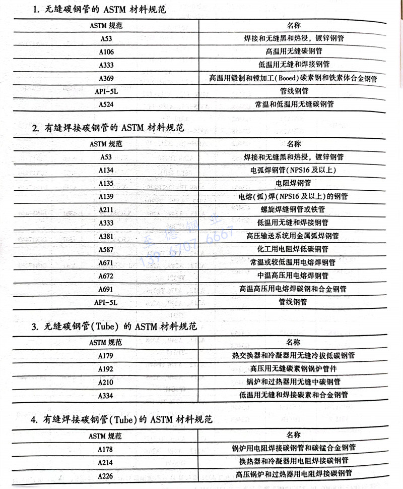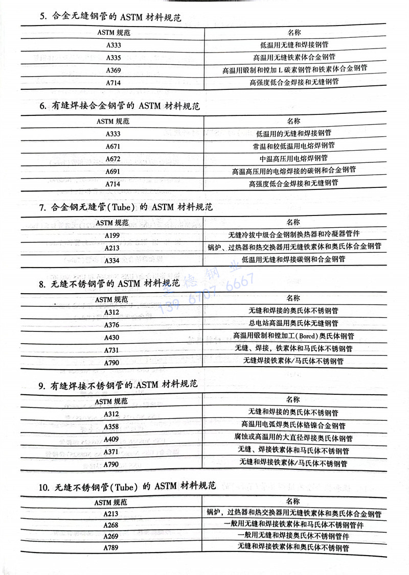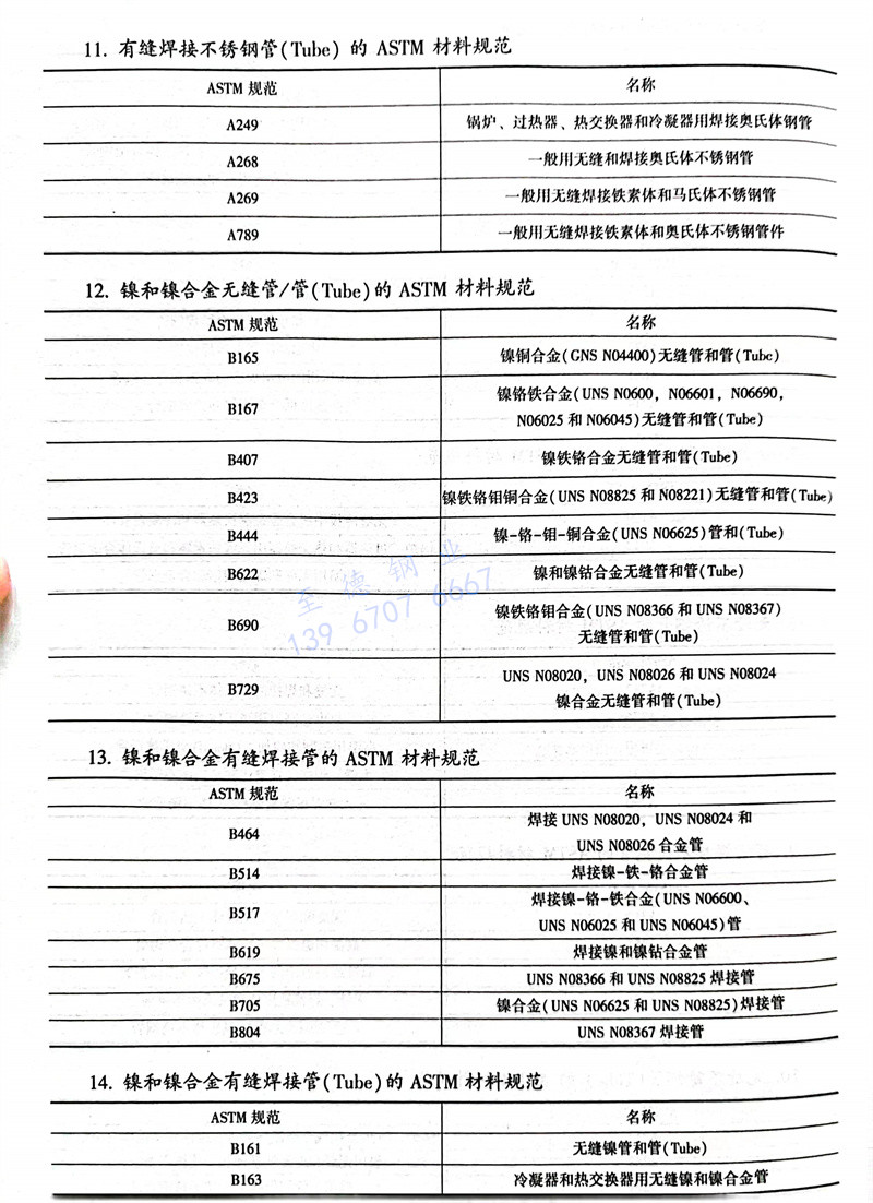 ASTM标准常用钢、镍、铜、铝、钛及合金管