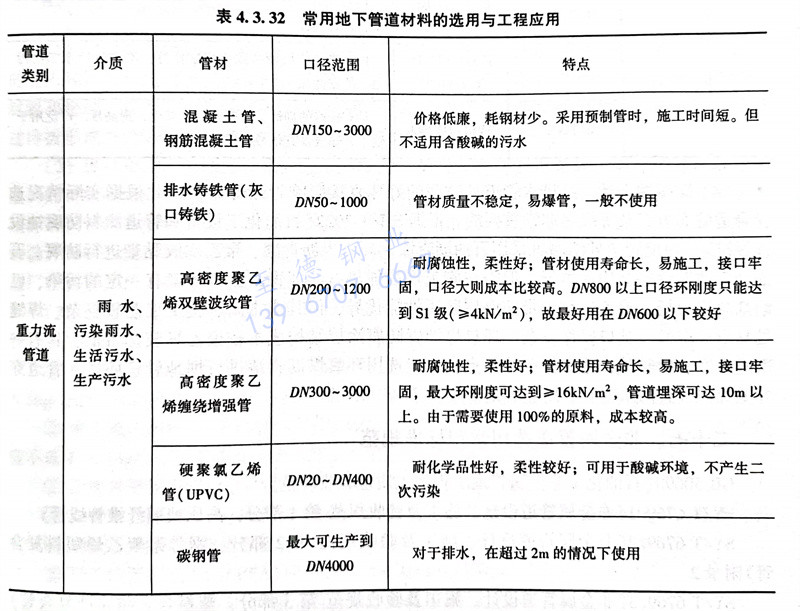 除生活给水管室内部分采用塑料管外,其余给水管道一般钢管,焊接连接。含油污水、生产污水管道建议采用输送流体用无缝钢管,焊接连接,也有的采用低压流体输送用焊接钢管。雨水管道一般采用球磨铸铁管,承插连接。球墨铸铁管耐腐蚀性能较强、管壁较厚、对管道基础的要求较低、施工费用低。生活污水管道室内部分一般采用建筑排水用PVC-U管道,粘接连接;室外部分一般采用低压流体输送用焊接钢管,焊接连接,以避免过路时生活污水管道被压损。钢骨架增强塑料复合管作为新型管材,具有机械强度高、耐温性能好、双面防腐、节能等优点,适用于绝大部分石油化工给埋地排水管道。常用地下管道材料的选用见表4.3.32。