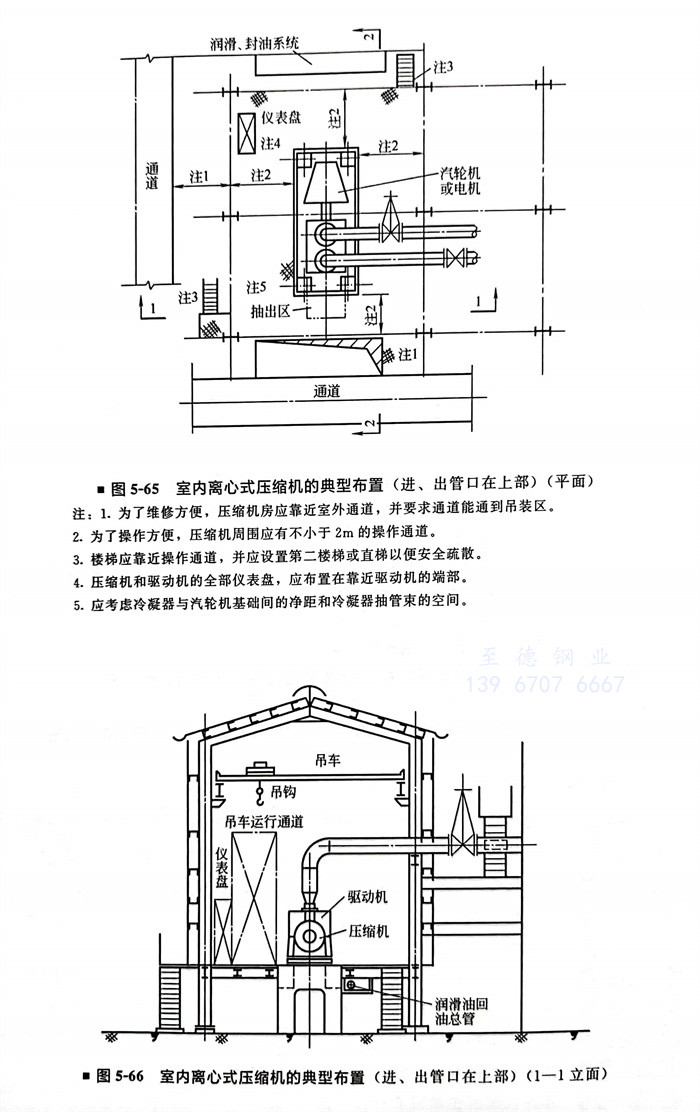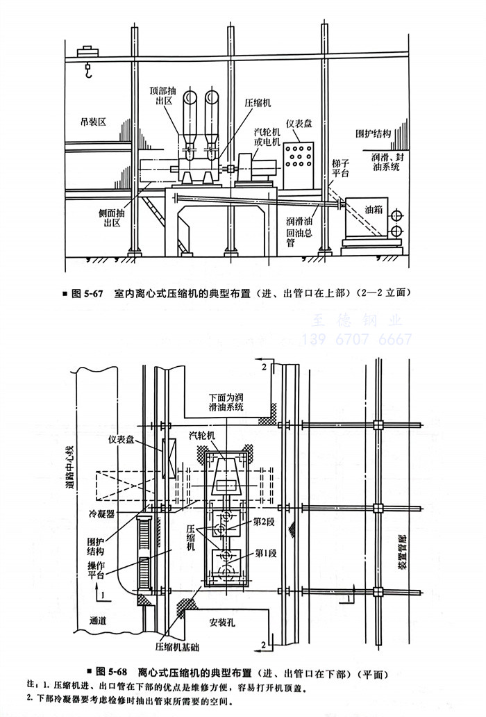 室内离心式压缩机的典型布置(进、出管口在上部)(图5-65~图5-67)
