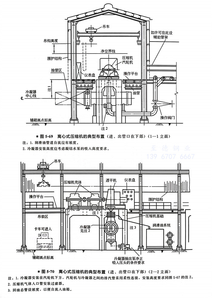 ①. 吊车的起吊高度应满足压缩机制造厂要求。一般情况下,制造厂应给出机组中心线到吊车梁底面的净空高度。