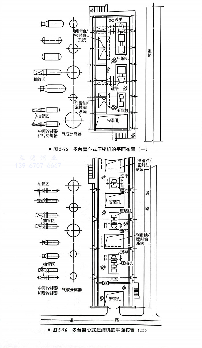 多台离心式压缩机的平面布置(图5-75、图5-76)