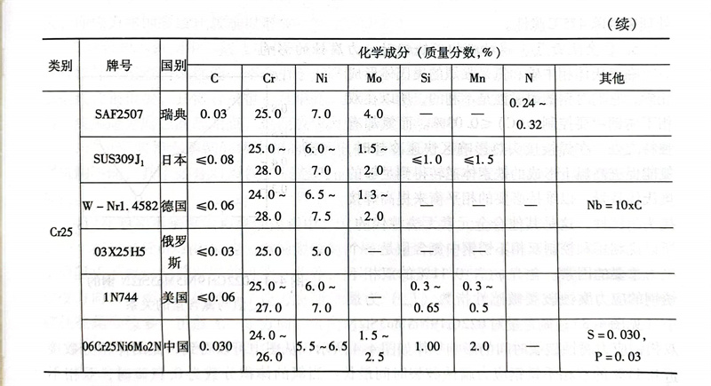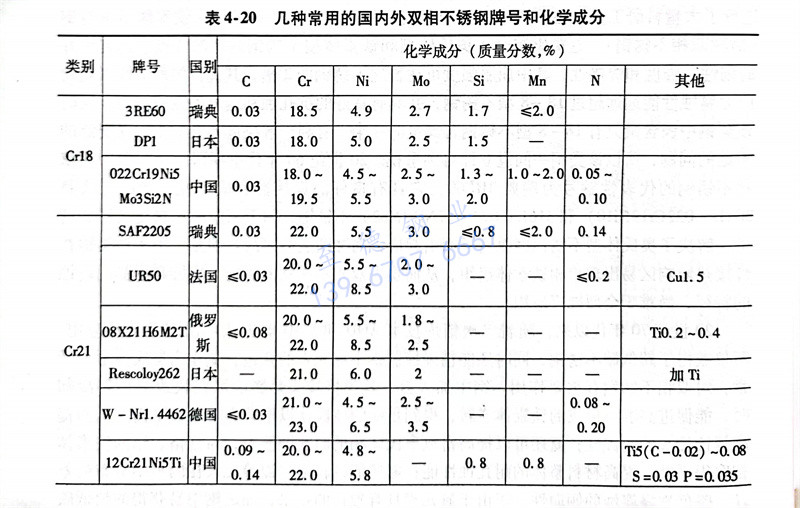 双相不锈钢按铬的含量不同,可分成Cr18型、Cr21型和Cr25型三类,几种常用的国内外双相不锈钢牌号和化学成分见表4-20。这三类双相不锈钢的相比例(体积分数,%)大致为:铁素体相为40~60,奥氏体相为60~40。这个相比例为双相不锈钢的理想比例,对提高耐应力腐蚀能力极为有利。