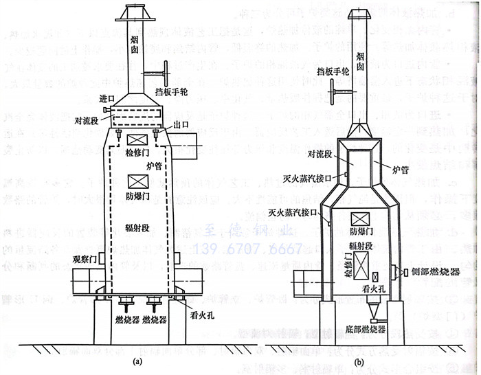 ①. 辐射室也称为炉膛,包括燃烧器和风道、炉管和炉管支撑、耐火衬里等,传热方式主要是热辐射,全炉热负荷的70%~80%是由辐射室担负的,是全炉中最重要的部分。由于火焰温度很高,可达1500~1800℃,故不能直接冲刷炉管。火焰离炉管远,辐射传热量小,所以应尽量减小炉膛体积,节省投资。辐射室炉墙由耐热层、隔热层和保护层组成。耐热层除能耐高温,还有再辐射性能,能将吸收的热量再辐射给炉膛。耐热层有耐火砖砌筑和耐火衬里两类。尤其是陶瓷涂料耐火衬里,不仅耐高温、耐振动、有良好的绝热性,而且辐射系数高,增加了辐射能力。