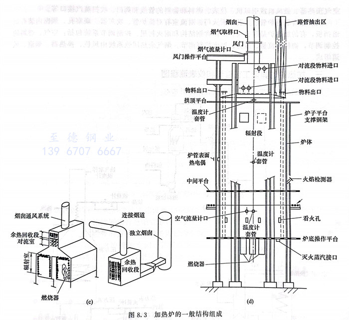 辐射室有辐射炉管、人孔、看火门。对流室有对流炉管、吹灰器、观察孔。烟囱内装有烟道挡板,有的加热炉是联合囱。炉体含钢结构和耐火衬里。控制调节系统包括:空气、燃料的控制调节,物料的流量、压力、温度控制调节。烟气余热回收系统由风机、换热器、烟道、风道组成。