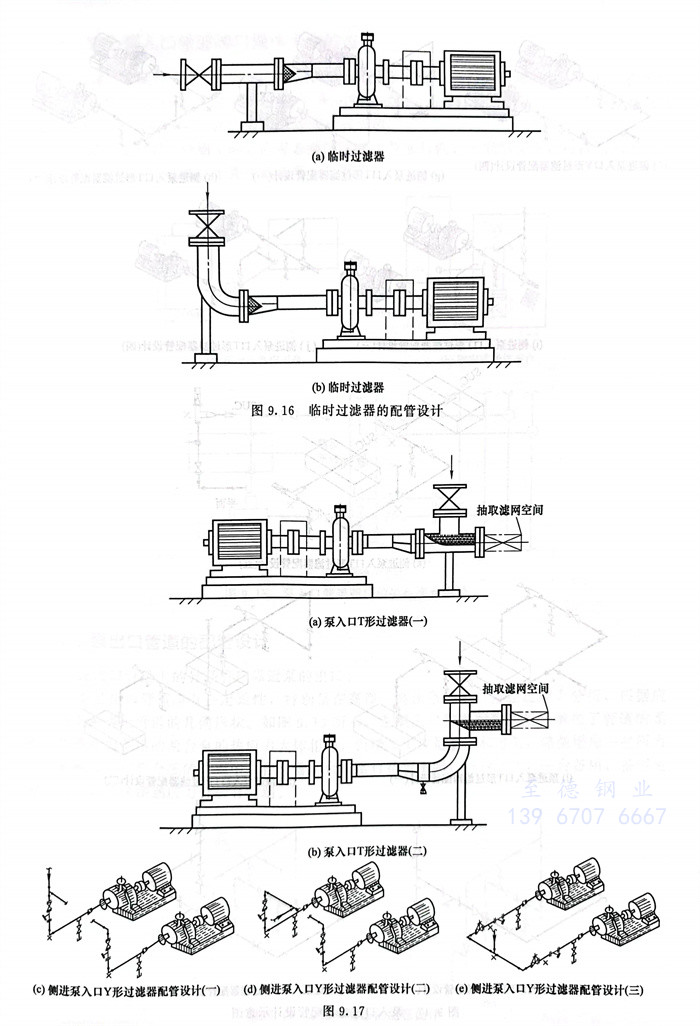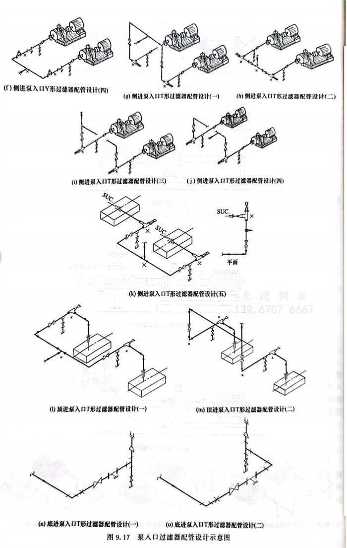泵入口永久过滤器通常用Y形或T形过滤器,典型的泵入口过滤器配管设计见图9.17。