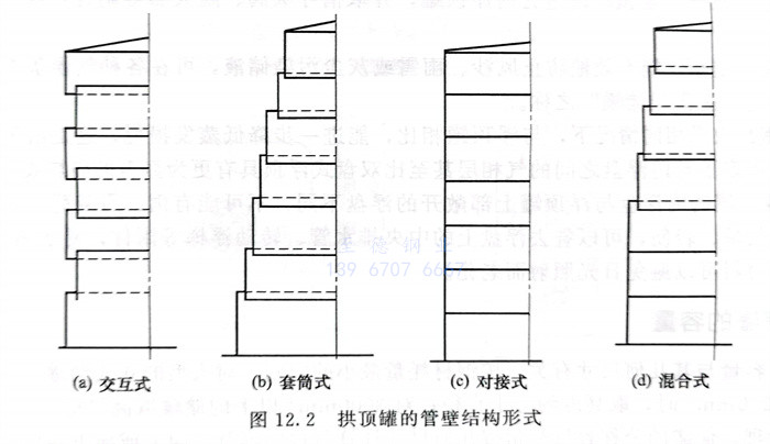 罐壁是主要受力部件,壁板的各纵焊缝采用对接焊,环焊缝采用套筒式或对接式,也有采用混合式连接,如图12.2所示。拱顶罐的罐顶近似于球面,按截面形状有准球形拱顶和球形拱顶两种,见图12.3。拱顶油罐由于气相空间大,油品蒸发损耗大,故不宜储存轻质油品和原油,宜储存低挥发性及重质油品。