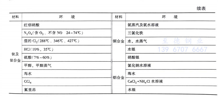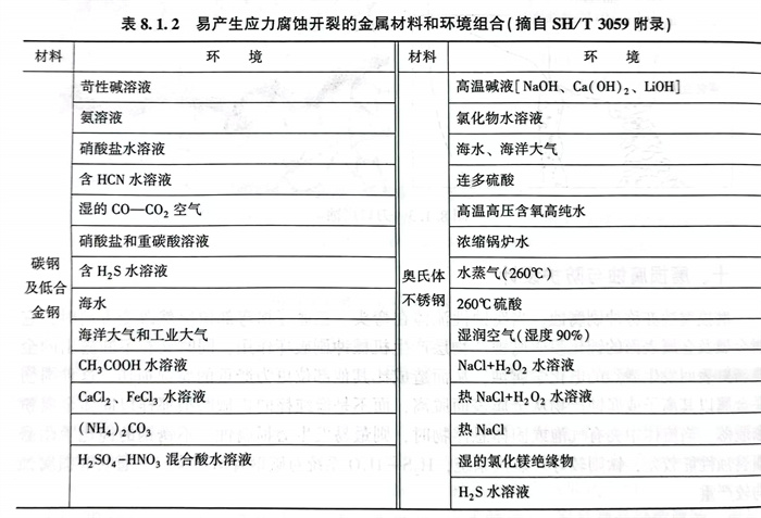 应力的来源,对于管道来说,焊接、冷加工及安装时残余应力是主要的。并不是任何金属与介质的共同作用都引起应力腐蚀破裂。其中金属材料只有在某些特定的腐蚀环境中,才发生应力腐蚀破裂。表8.1.2是容易引起应力腐蚀破裂的管道金属材料和腐蚀环境的组合。