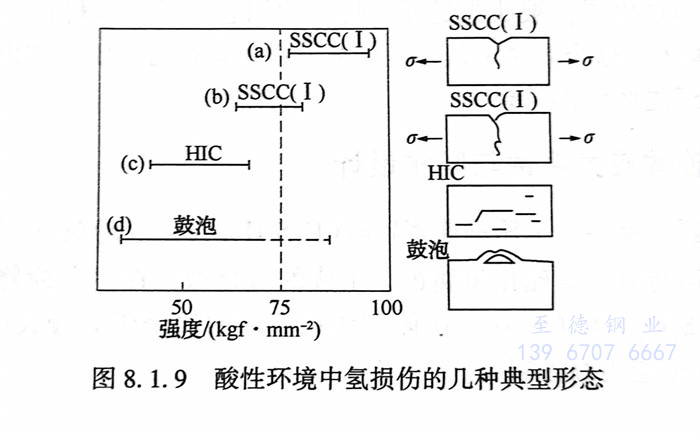 湿H环境中的开裂类型有:氢鼓泡(HB)、氢致开裂(HIC)、硫化物应力腐蚀开裂(SSCC)、应力导向氢致开裂(SOHIC)。见图8.1.9和图8.1.10。