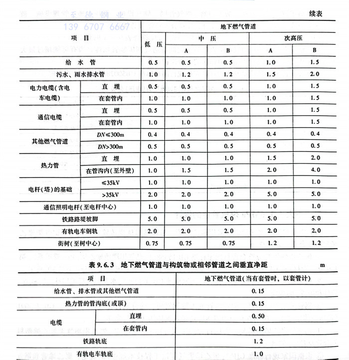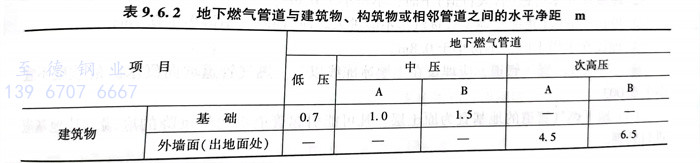 2. 地下燃气管道不应从建筑物和大型构筑物的下面穿越。地下燃气管道与建筑物、构筑物或相邻管道之间的水平和垂直净距,不应小于表9.6.2和表9.6.3的规定。