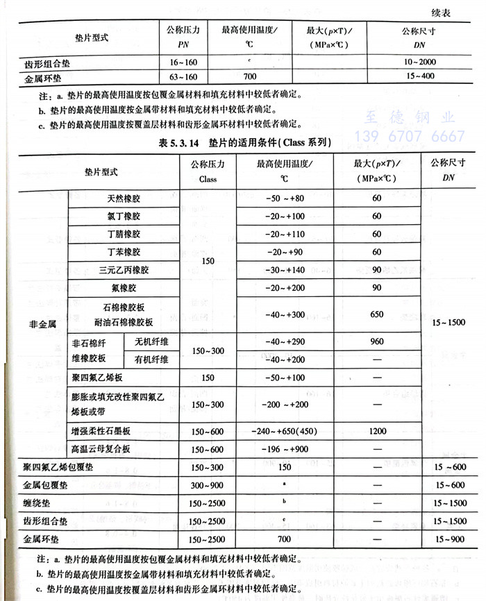 d. 金属包覆垫根据包覆金属和填充材料的不同组合,使用温度范围不同,详见HG/T 20609。