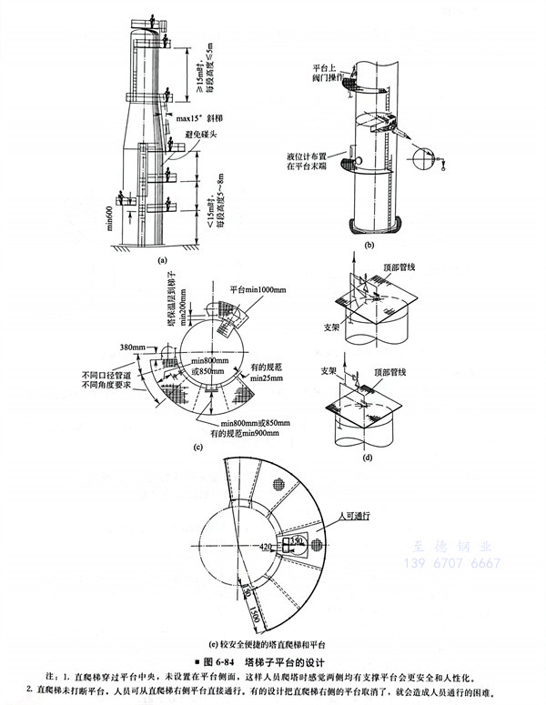 ④. 高度在15m及以下时,每段高5~8m为宜,超过15m时,每段应不高于5m,否则应设中间休息平台(按SH3011的规定)。