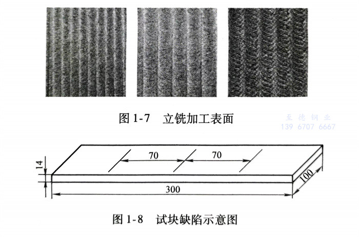 采用Q235碳素结构钢制作试块,试块尺寸长300mm、宽100mm、厚14mm。首先,将三块试块表面利用飞刀进行铣削加工,如图1-6所示,其表面粗糙度值从左到右依次为Ra3.2μm、Ra6.3μm、Ra12.5μm,编号1、2、3。然后,利用立铣加工另外三块试块表面,如图1-7所示,其表面粗糙度值从左到右依次为 Ra3.2μm、Ra6.3μm、Ra12.5μm,编号4、5、6。另外,再采用平磨加工一块试块表面,此种方式获得的表面质量较好,其表面粗糙度值为Ra0.2μm,编号7。所有试块表面均刻有一组宽度为20μm,深度不同的人工线状缺陷,尺寸如图1-8所示,从左到右深度依次为20μm、45μm、70μm,相邻缺陷的间距为70mm。