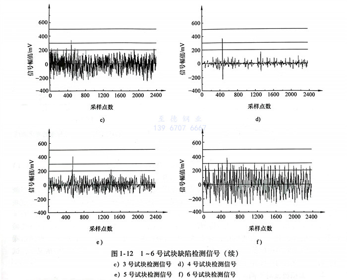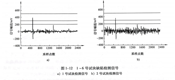 保持试验条件不变,探头以相同速度扫查所有试块,对不同深度的裂纹进行漏磁检测。各试块得到的缺陷检测信号如图1-12所示。
