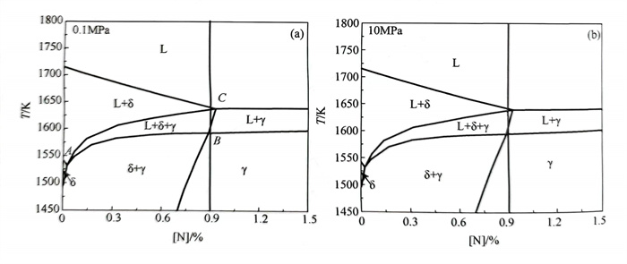 19Cr14Mn0.9N含氮钢凝固过程中铁素体相8和奥氏体相γ的单相区随压力的变化规律如图2-95所示。当压力从0.1MPa增加到100MPa时,δ/(δ+L)相边界变化较小,8/(δ+γ)相边界整体向高温端移动,铁素体相8形成区域逐渐减小;当压力进一步增加到1000MPa时,铁素体相8单相区几乎从随氮质量分数变化的垂直截面相图中消失,如图2-95(a)所示,即增加压力有助于铁素体相δ的消失[138].而对于奥氏体相γ,随着压力的增加,γ/(y+L)相边界向高温段移动,γ/(δ+γ)相边界整体向高氮区移动,整个区域呈增大趋势,如图2-95(b)所示。