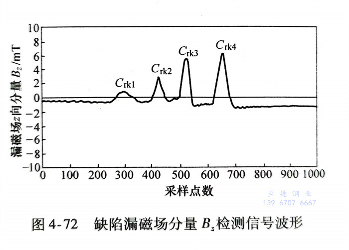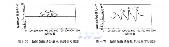 图4-58所示缺陷分别为用于校验设备的标准人工刻槽和钢管轧制过程中形成的自然斜向缺陷。与标准刻槽相比,斜向缺陷走向与磁化场之间存在一定倾斜夹角,会导致相同尺寸斜向缺陷的漏磁场强度更低,从而容易形成漏检。